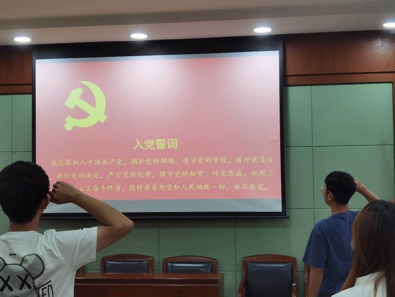 会议第二项,支部成员全体起立,面向党旗举起右拳,在申有鹏同志领读下重温入党誓词。