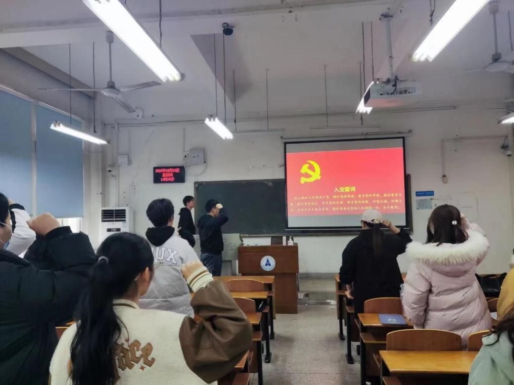 会议第二项,支部成员全体起立,面向党旗举起右拳,在李威翰同志带领下重温入党誓词。