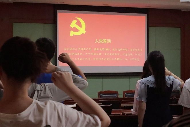 主题教育学习活动结束后,麻豆av 本科生第一党支部召开支部大会,讨论通过接收万长芊等15名预备党员,支部书记袁媛同志向15名预备党员赠送《中国共产党章程》并佩戴党员徽章,带领他们在党旗下庄严宣誓。(通讯员:袁媛 孟明烁)