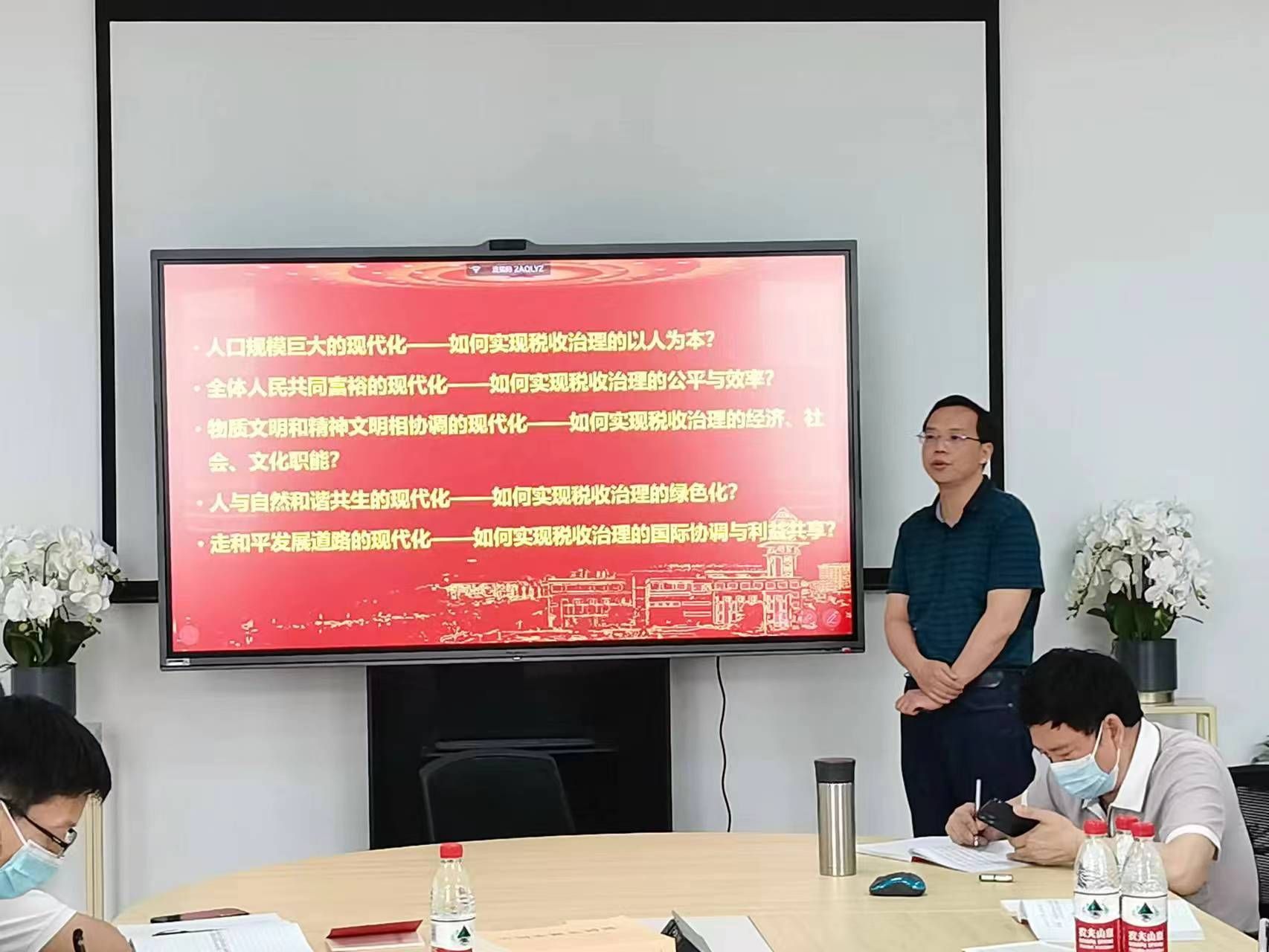 按照本次主题党日活动提出的主题教育讲党课要求,薛钢同志以《习近平新时代中国特色社会主义思想和税收现代化》为题讲党课,部分研究生、本科生党员参加了本次党课联学活动。薛钢同志从习近平新时代中国特色社会主义思想的形成、发展、核心命题、主要内容等方面谈了在主题教育活动中的学习体会;结合中国式现代化,和与会党员交流了税收治理现代化研究中的以人为本、公平和效率、绿色化、国际协调和利益共享等内容;结合《习近平总书记在中共中央政治局第五次集体学习时的讲话》,从中国特色社会主义税收理论视角对税收教育领域创新和人才培养质量提升谈了自己的观点和看法。
