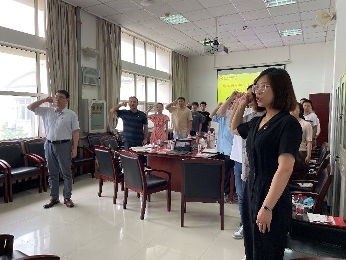 活动第二项,支部成员全体起立,面向党旗举起右拳,在麻豆av 党委副书记吴兴华同志带领下,重温入党誓词。