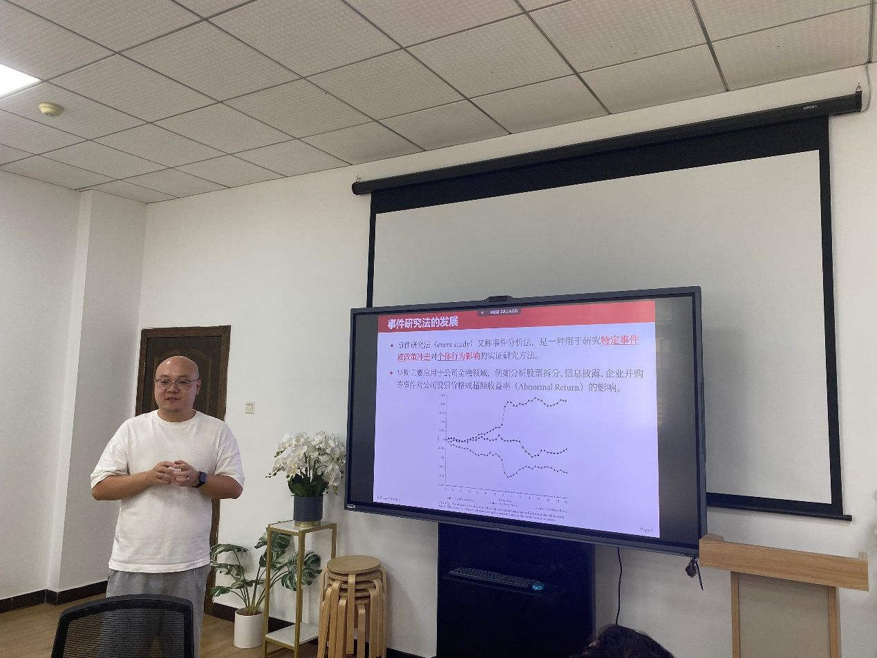 为进一步打造税务系“兴税育人”品牌,支部依托湖北省高校“双带头人”教师党支部书记工作室建设,在教师教研能力提升、学生学习能力培养、政企学三方联建共建等方面更好地发挥支部的力量。本次主题党日活动,邀请了税务系张子尧副教授就“事件研究法及其在税收教研中的应用”,向与会教师进行专题介绍。张老师围绕事件研究法精要、财税领域中的应用以及教学体验三块内容展开,通过回顾事件研究法的发展历程,介绍了事件研究法的适用情景、基本设定和实现方法,展示了该方法在我国财税领域研究的应用潜力和广泛前景,进而就在事件研究法等方法教学中引导学生正确理解理论知识与工具知识的关系等方面提出建议,并回答了与会老师的问题。