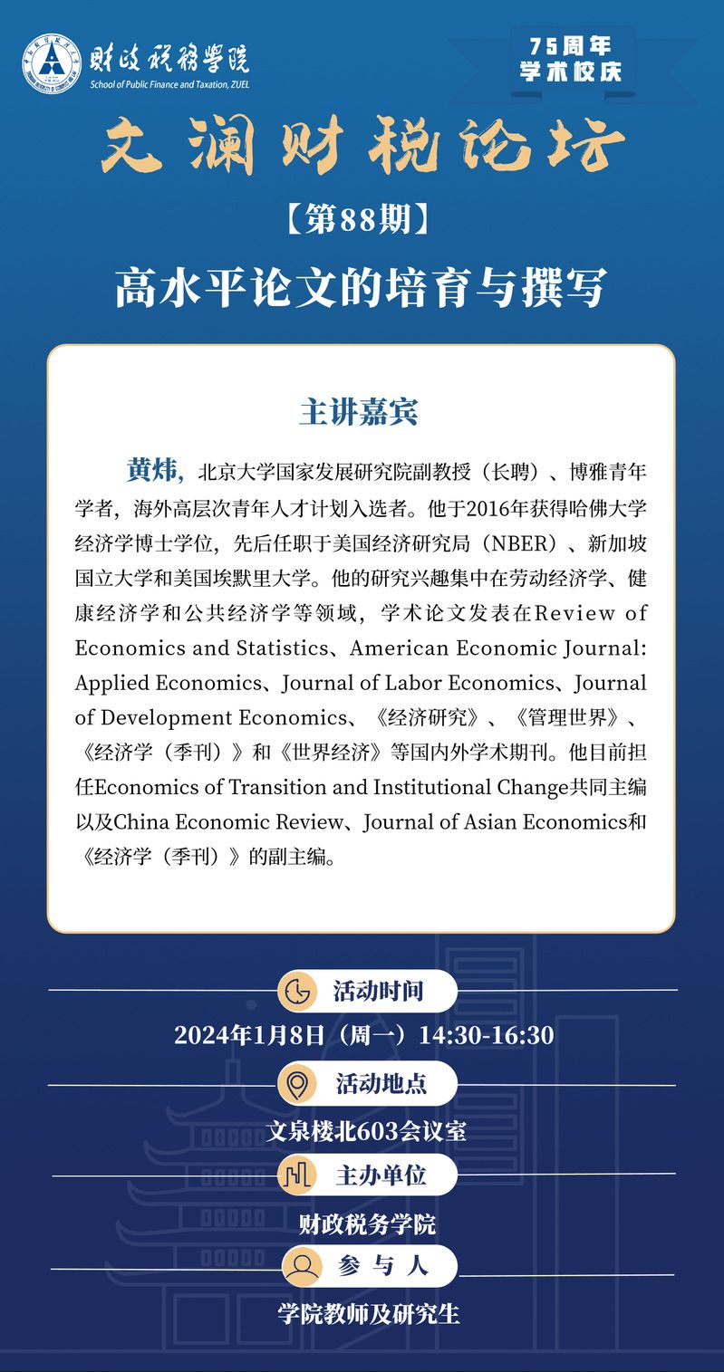 75周年学术校庆讲座 | 文澜财税论坛(第88期):北京大学国家发展研究院黄炜副教授