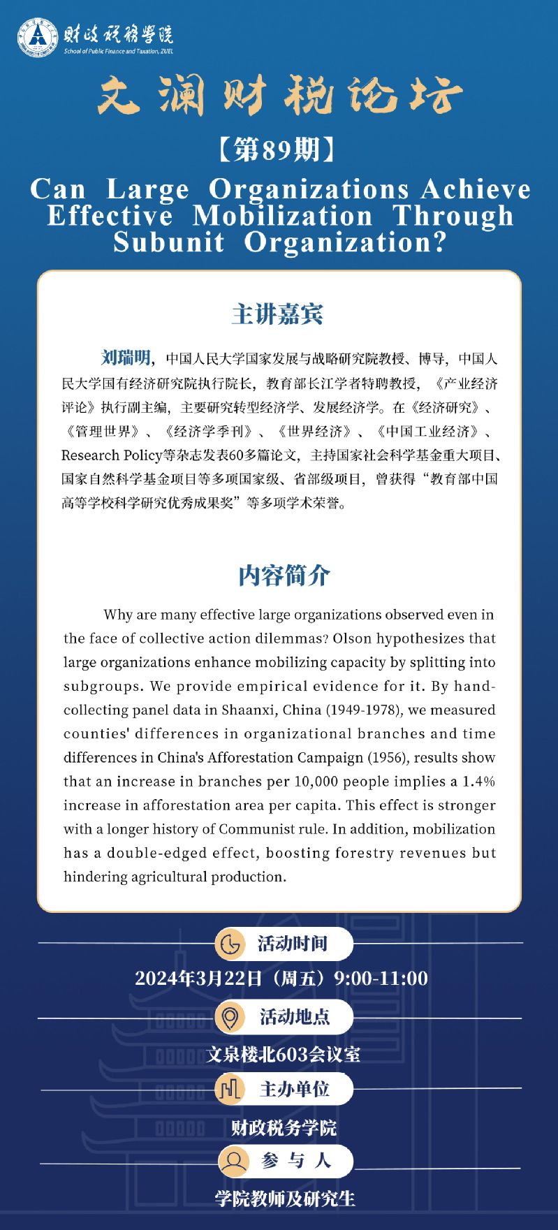 文澜财税论坛(第89期)| 中国人民大学国家发展与战略研究院刘瑞明教授