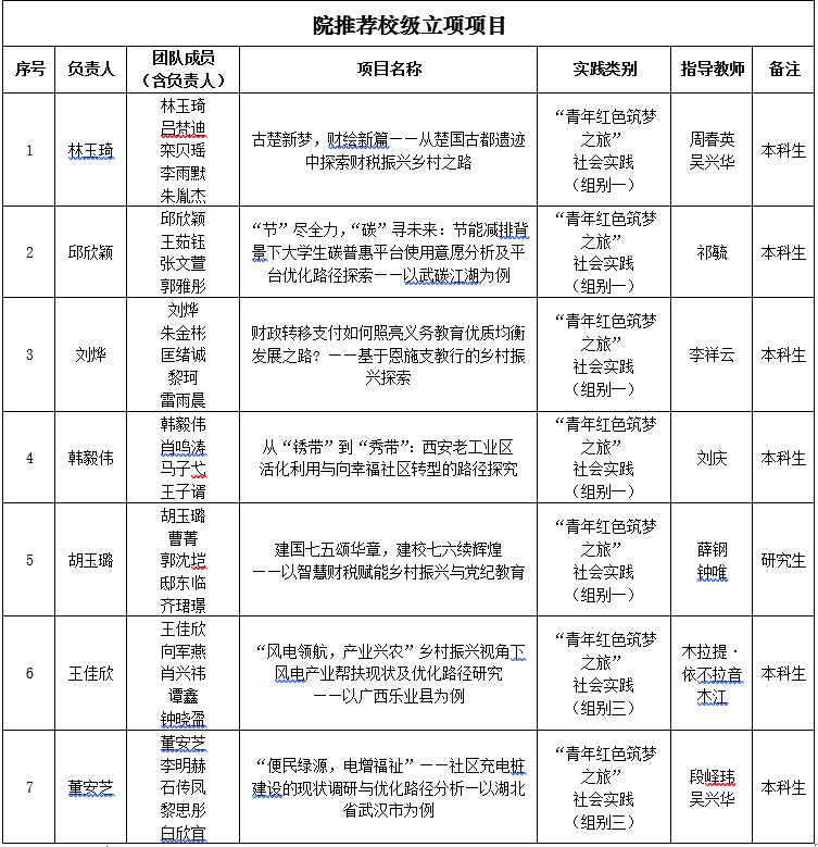 根据校团委《关于组织开展“读懂中国·行走的思政课”2024年暑期社会实践活动的通知》要求,经麻豆av 分团委与专家评审认真审核,拟推荐《古楚新梦,财绘新篇——从楚国古都遗迹中探索财税振兴乡村之路》等7份院推社会实践立项申报项目参加校级暑期社会实践立项评选,具体名单公示如下。如有任何意见,可在公示期内向麻豆av 分团委反映。