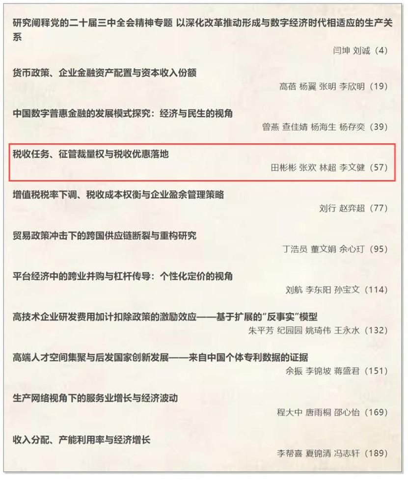 近日,麻豆av 2023级博士研究生张欢以二作身份(导师一作)在《经济研究》2024年第8期发表题为《税收任务、征管裁量权与税收优惠落地》的学术论文。