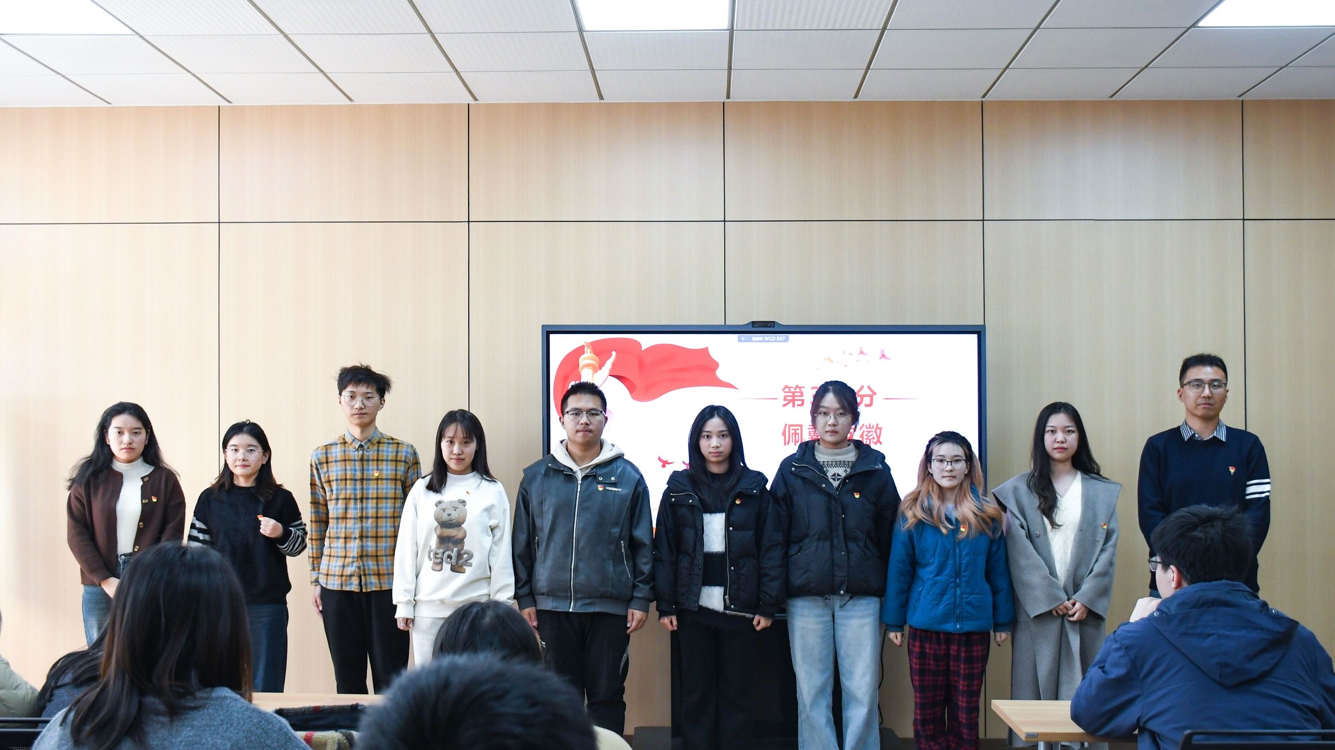 大会第二部分,举行入党宣誓仪式。由刘旻妤同志领誓,全体党员面向党旗,举起右手庄严宣誓。党支部书记段峄玮同志为新发展的九名预备党员佩戴党员徽章。