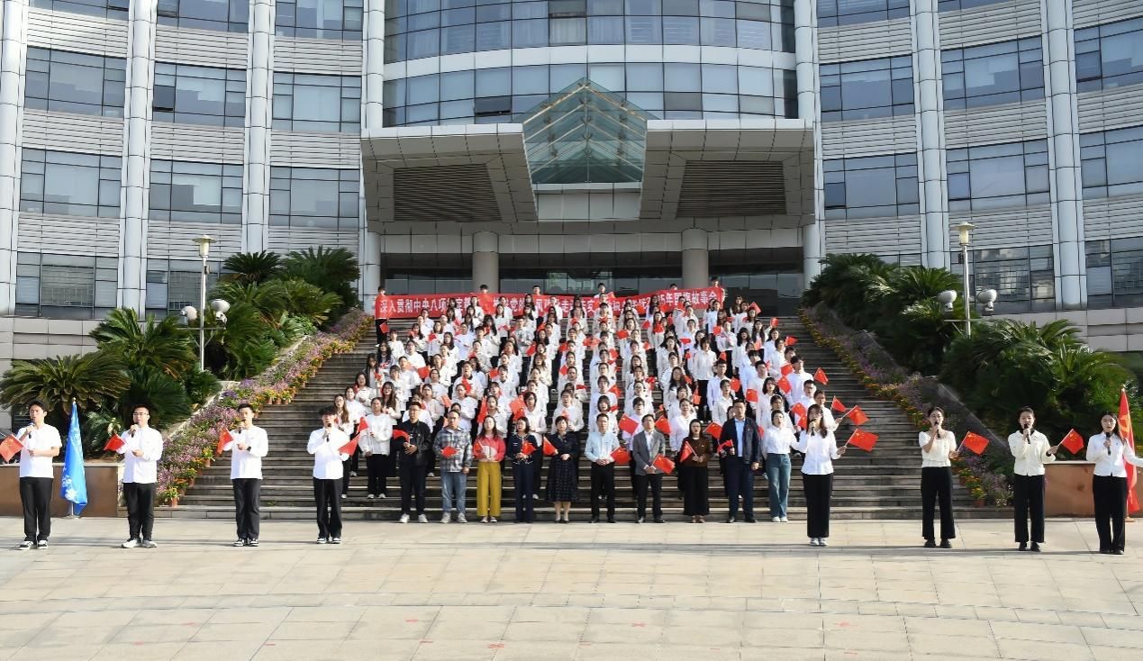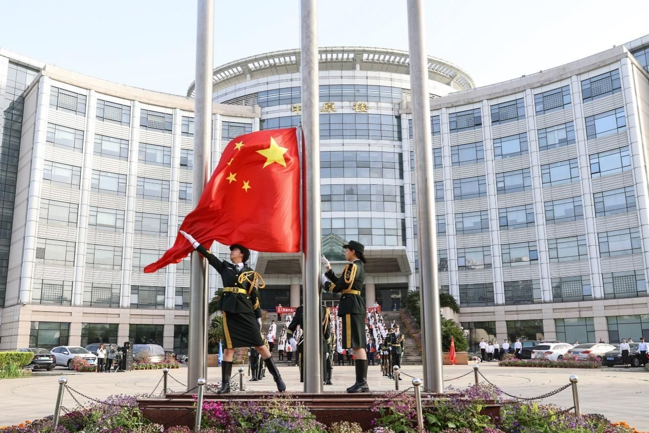 上午7时整,升旗仪式正式开始。国旗护卫队迈着铿锵有力的步伐护送国旗至升旗台,擎旗手振起右臂,国旗迎着朝阳在空中展开。伴随着《义勇军进行曲》响起,全体师生向冉冉升起的五星红旗肃立致敬,齐唱国歌。