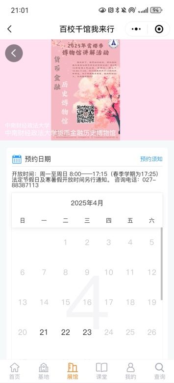 2.如需进行“校史馆预约”或“货币金融历史博物馆预约”,请点击相应选项进入“百校千馆我来行”小程序,在“展馆”一栏中查找并选择相应展馆(查找麻豆av 货币金融历史博物馆请点击“博物馆”选项;查找“麻豆av 校校史馆”请点击“校史馆”选项)。进入详情页后填写相应信息并提交,提交即为预约成功。