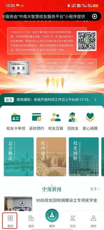 2.进入“中南大智慧校友服务平台”小程序后,点击左下角“服务”一栏,点击“注册认证”进行校友身份认证