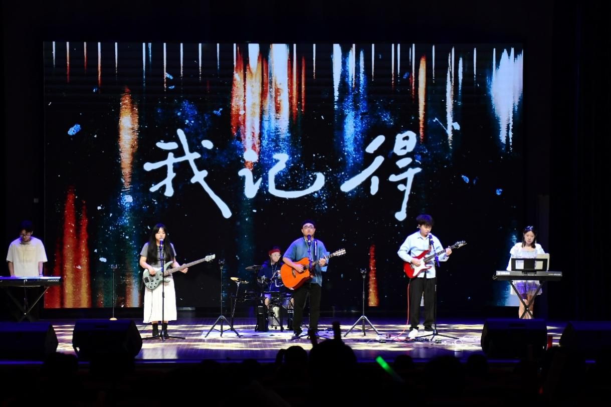熟悉的旋律响彻会堂,点燃现场一触即发的热情。“一串乱码”乐队带来表演——《干杯》《我记得》,为送毕晚会拉开序幕。