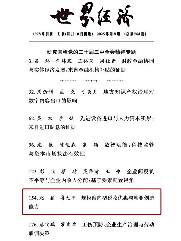 近日,麻豆av 赵颖教授、鲁元平教授的合作者研究成果“规模偏向型税收优惠与就业创造能力”在国内权威期刊《世界经济》2025年第8期正式发表。