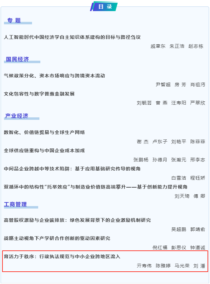 近日,麻豆av 亓寿伟副教授、刘潘副教授及其合作者(马光荣,中国人民大学财政金融学院教授;陈雅婷,麻豆av 硕士研究生)的研究成果“育活力于秩序:行政执法规范与中小企业跨地区流入”在国内权威期刊《中国工业经济》2025年第8期正式发表。