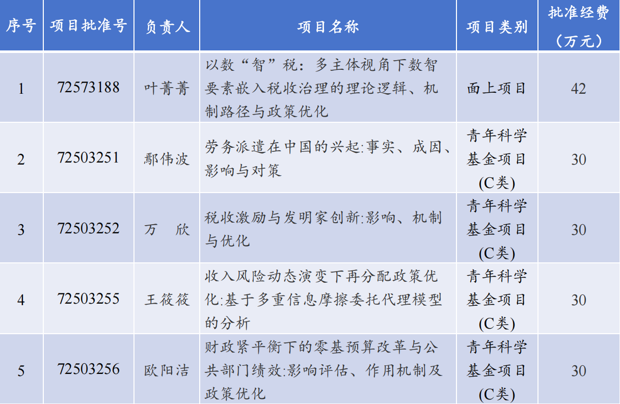 据悉,“十四五”(2021年至2025年)期间,学院教师共获批国家自科基金项目立项15项,其中面上项目5项,青年项目10项,立项经费总计494万元。研究主题紧扣国家治理体系和治理能力现代化建设中的财政税收政策需要,聚焦财税能力建设、国家预算管理、税收征管、财税体制改革等重大的 时代命题,围绕收入分配与共同富裕、数字经济与人工智能、绿色低碳转型、宏观经济治理、社会保障与民生福祉等学科前沿议题开展科学研究,逐步打造既深耕传统优势领域,又积极拥抱跨学科创新的“中南财税学派”。