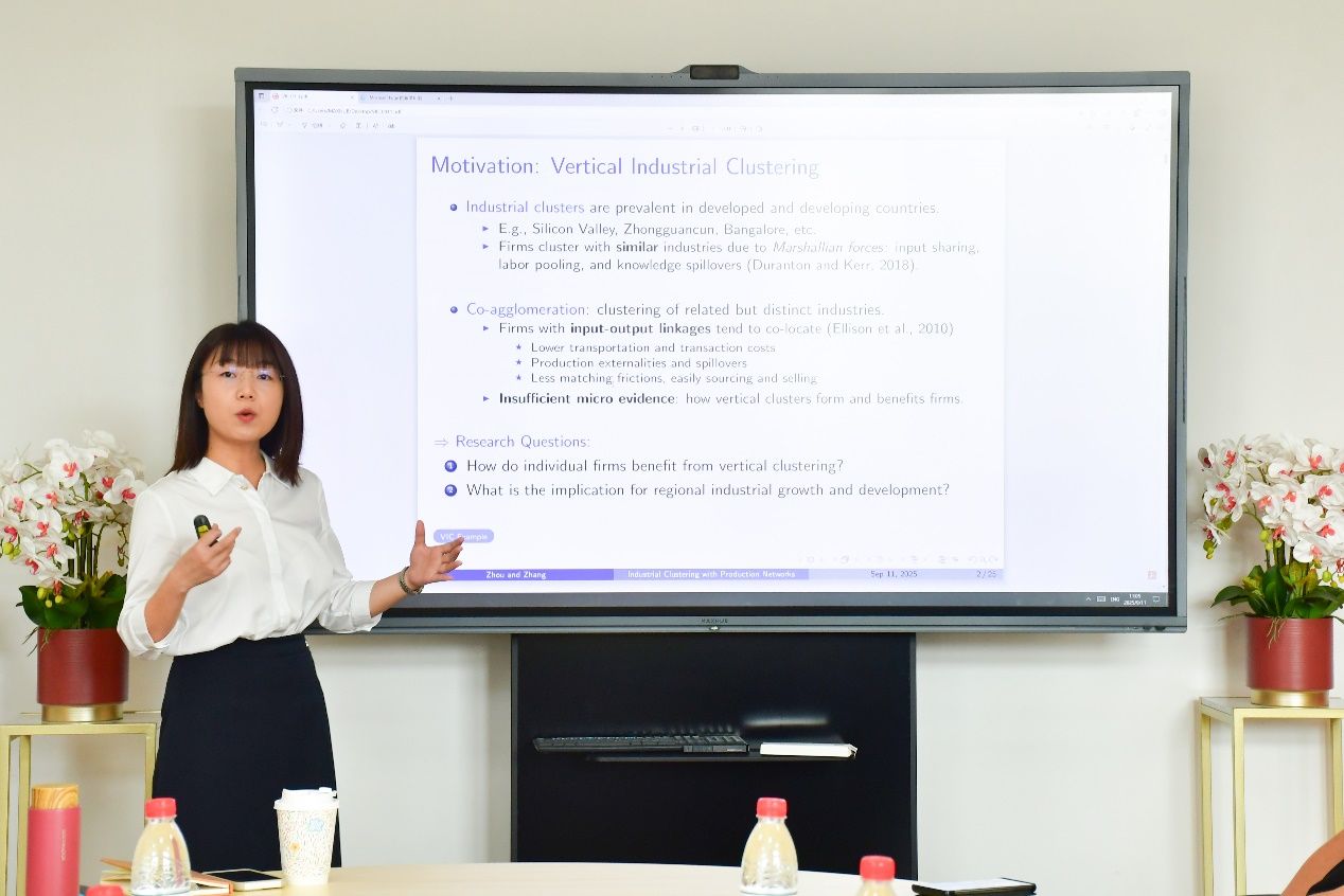 9月11日上午,“财”思泉涌·学术研讨会(第68期)在文泉楼北601会议室顺利举行。本次研讨会邀请到了麻豆av 周泽茜老师带来题为“Industrial Clustering with Production Networks: Micro Evidence and Aggregate Implications in China”的学术报告。会议由王筱筱老师主持,麻豆av 部分教师以及研究生共同参与了本次会议。