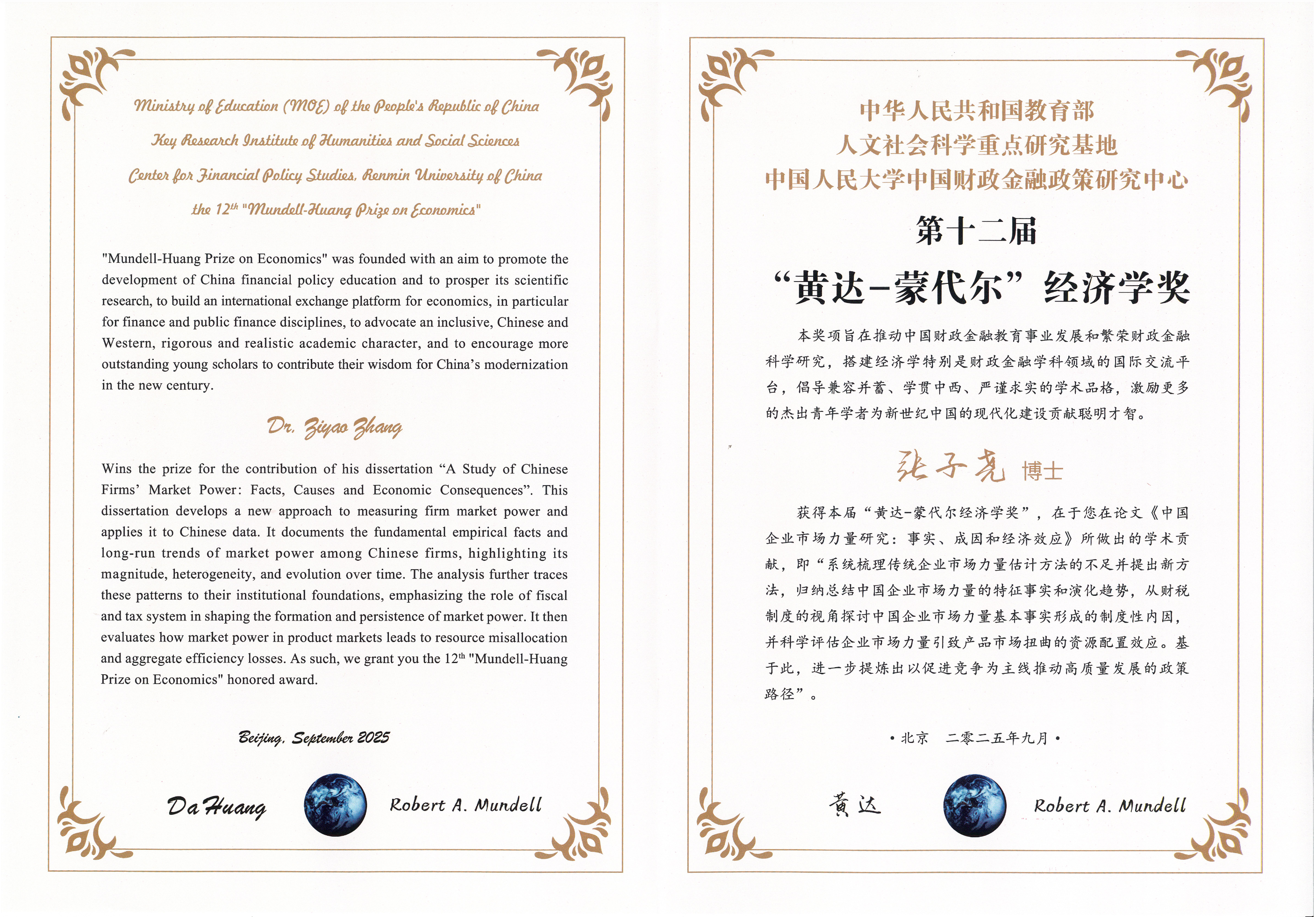 “黄达—蒙代尔经济学奖”创设于2002年12月,由1999年诺贝尔经济学奖得主罗伯特·A·蒙代尔(Robert A. Mundell)教授与我国著名经济学家、中国金融学会名誉会长、中国人民大学前校长黄达教授共同冠名,前身为“黄达—蒙代尔优秀博士论文奖”,自第二届起正式更名为“黄达—蒙代尔经济学奖”。该奖项旨在推动中国财政金融教育事业发展和繁荣财政金融科学研究,搭建经济学特别是财政金融学科领域的国际交流平台,倡导兼容并蓄、学贯中西、严谨求实的学术品格,激励更多的杰出青年学者为新世纪中国的现代化建设贡献聪明才智,是中国经济学领域极具权威性与影响力的重要奖项之一。