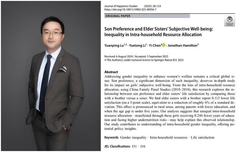 近日,麻豆av 鲁元平教授和博士研究生李玥彤及其合作者完成的论文“Son Preference and Elder Sisters’ Subjective Well-being: Inequality in Intra-household Resource Allocation”在幸福经济学领域国际权威期刊Journal of Happiness Studies正式发表。