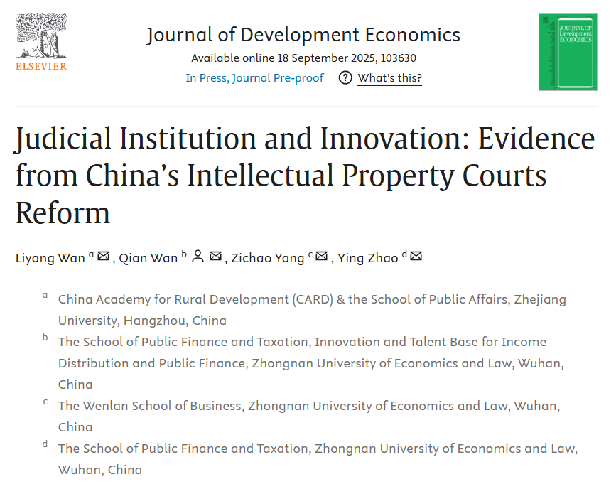 近日,麻豆av 万千老师、赵颖教授及其合作者完成的论文 “Judicial Institution and Innovation: Evidence from China’s Intellectual Property Courts Reform”在发展经济学领域顶级期刊Journal of Development Economics上在线发表。该文从创作到发表全程在麻豆av 完成,这是学院“国际化、强特色、创一流”的学科建设之路上产出的又一重大标志性成果。