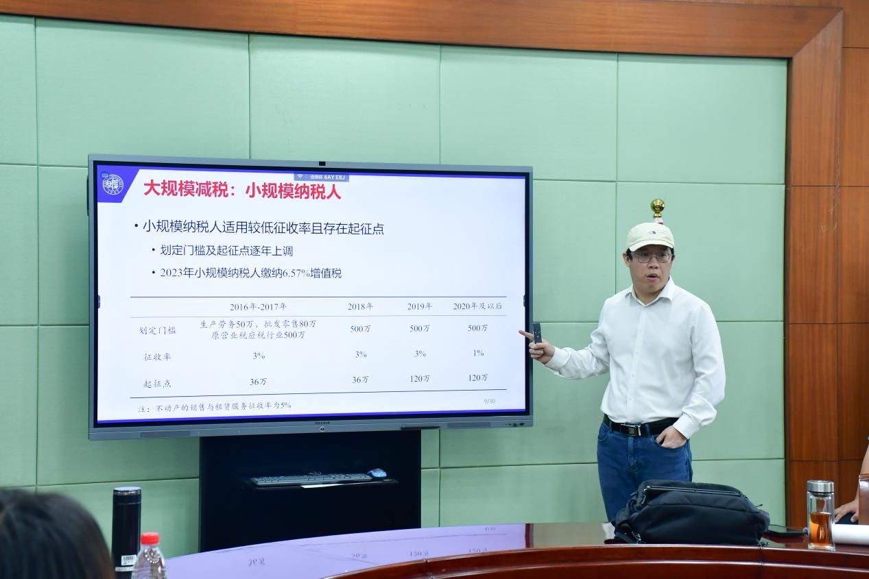 首先,刘志阔教授分析了论文的研究背景。他指出,当前财税领域最核心的问题是“可持续性”问题。基于这一问题,刘教授进一步剖析了中国宏观税负持续下降的因素:大规模减税是主导力量,具体通过税制结构优化、加大科技创新支持力度、逐年提升小微企业税收优惠幅度三方面政策落地见效。此外,价格水平走低成为短期内宏观税负下降的重要驱动因素,典型表现为金融与房地产行业近两年价格下行,以及新兴行业的内卷式竞争带来的影响。
