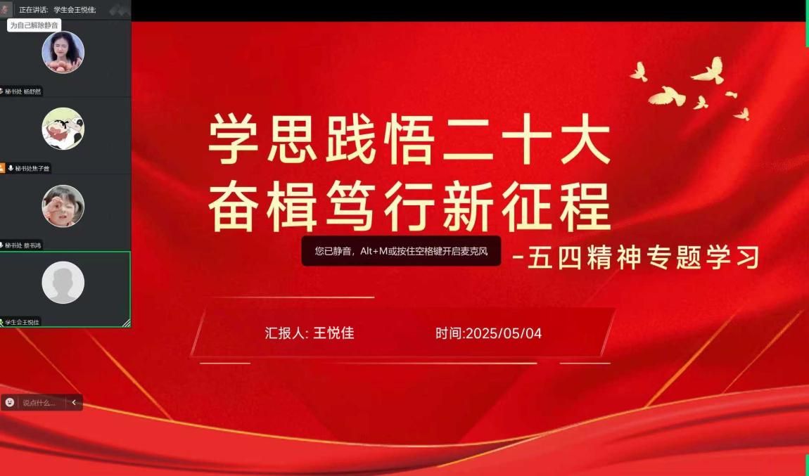 学生会于线上平台举办“学思践悟二十大,奋楫笃行新征程”五四精神专项学习会。本次会议由学生会全体学生干部参与,学院学生会秘书处王悦佳同学担任主讲。