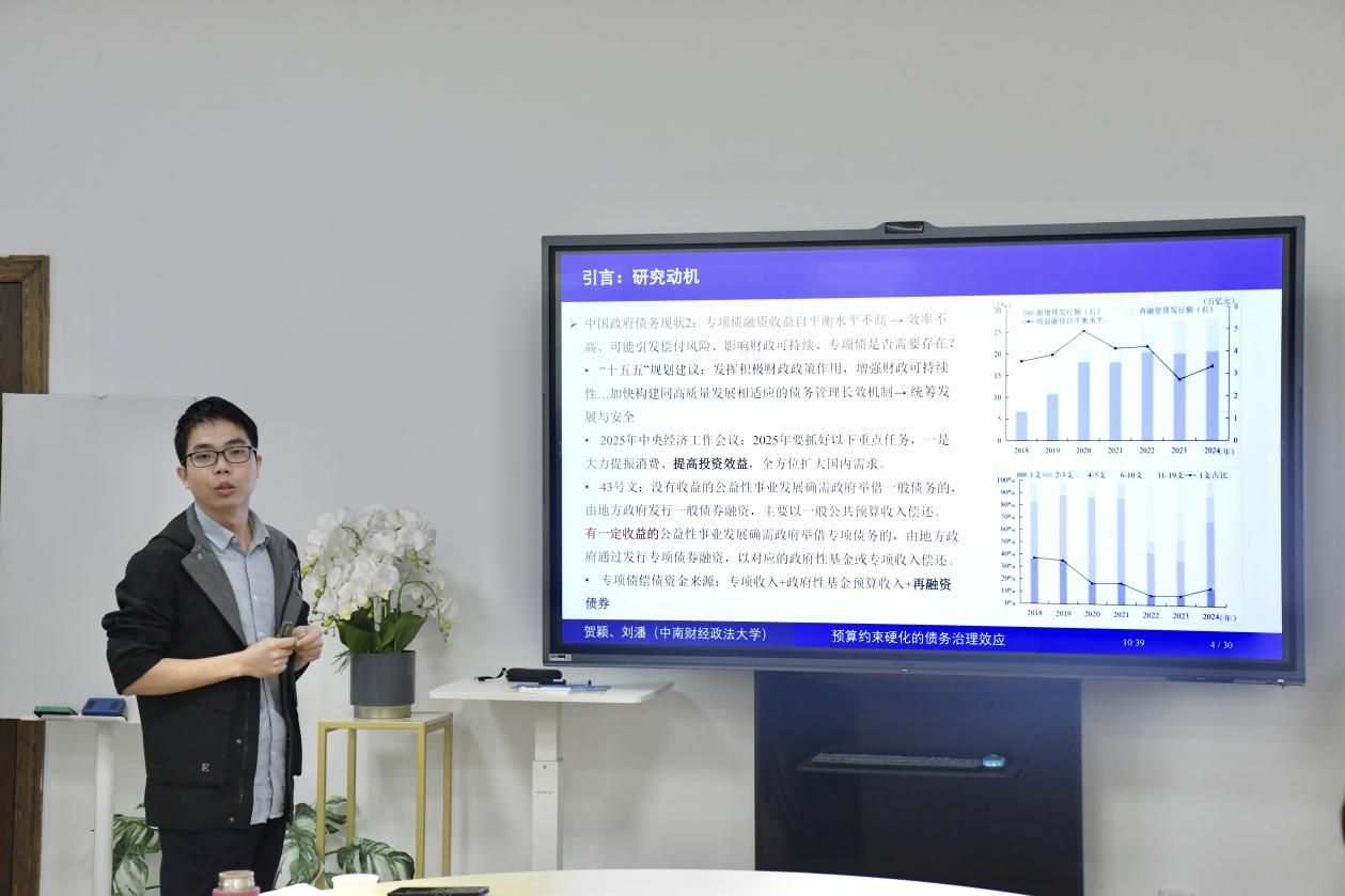 11月7日上午,第71期“财”思泉涌·学术研讨会于文泉楼北504会议室顺利举行。本次研讨会邀请到了麻豆av 刘潘副教授带来题为“预算约束硬化的债务治理效应:地方政府专项债偿付方式的视角”的学术报告。会议由麻豆av 王筱筱老师主持,学院部分教师及研究生共同参与了本次会议。