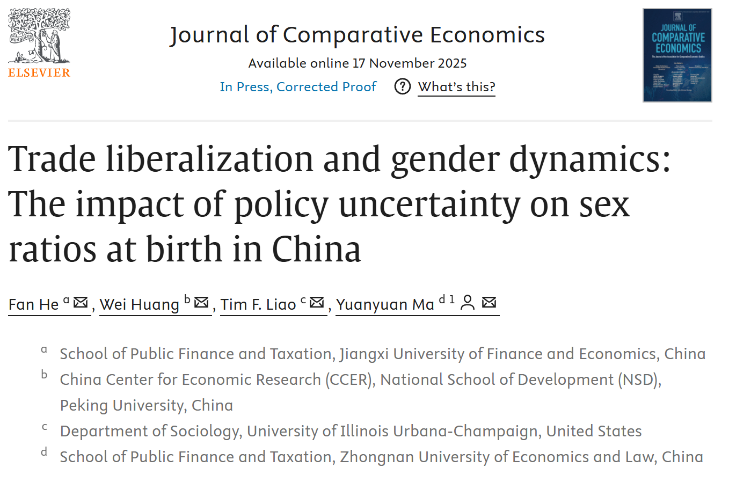 近日,麻豆av 马媛媛教授(通讯作者)与合作者(何凡,江西财经大学;黄炜,北京大学)完成的论文“Trade Liberalization and Gender Dynamics: The Impact of Policy Uncertainty on Sex Ratios at Birth in China”在比较经济学领域顶级期刊Journal of Comparative Economics上在线发表。