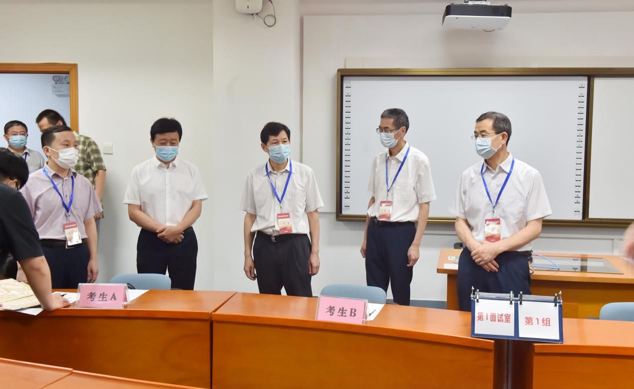 6月20日,国家公务员面试工作正式开启,一大早来自全国各地的考生有序进入学校,按照工作人员的指引顺利进入考场等待面试。上午8:15,湖北省税务局党委书记胡立升,局长秦守成,副局长何小平,纪检组组长孙争欢,麻豆av 党委常委、副校长申祖武,麻豆av 党委书记张永清等一行来到学校巡视指导考务工作。